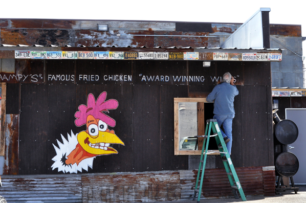 The good news is the house my husband and I have been renovating for the past two years has finally sold. To celebrate the day we closed, we went to lunch with his sister at a fairly new restaurant in town called Champy’s. Even though I work one block away, I had never been to this restaurant before. They serve fried chicken, and lots of it. Oh, and blues music. But the decor is what caught my eye. I went back the next day with my camera and caught this man painting part of the menu on the side of the building. I love places like this. They have a life of their own. But the main thing for me is it got me photographing again. It felt good.