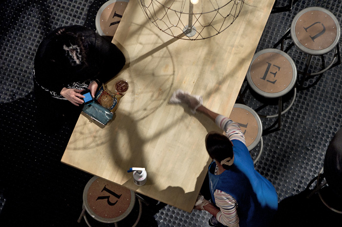 And then it happened. I saw the cleaning lady wiping down the tables. “MAYBE, just maybe she’ll come to where I need her to be,” I thought to myself. But then, a lady sat down right below where I was standing. I framed the shot right when the lovely cleaning lady moved into my photo. CLICK! And I was gone. I had two meetings to get to, and time ticking away on the parking meter. Perfect timing. Thank you to both of you!