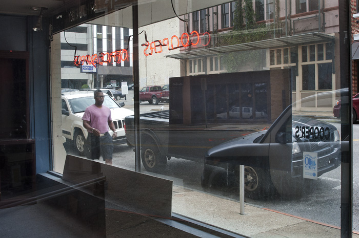 Cooper’s Office Supply on Cherry Street had some great reflections in their widows today. So! I stood there – focused and ready for someone to walk by.