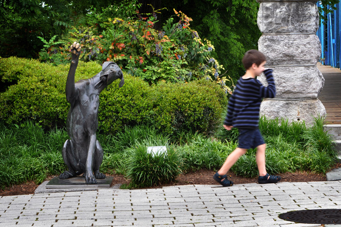 The first photo of this scene did not work out. A mother and daughter were looking at this sculpture when the younger son walked right in front of the dog as I was taking the photo. That’s no good. You couldn’t see the dog at all. So I……”scratched” it.