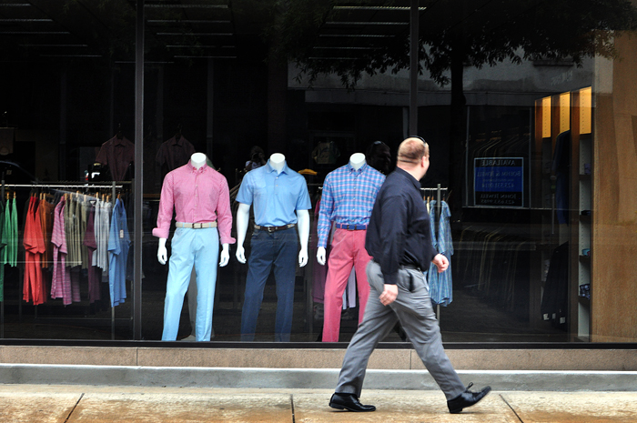 I love this window on a rainy day. The reflections are cut in half allowing the mannequins to stand out better. I may do a series on these windows – a different photo of each wardrobe change.