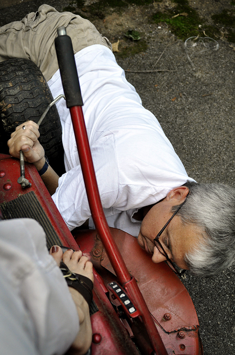 What was only going to take a few minutes to do, turned into a big mess. The belt on the riding lawn mower at the house we are renovating slipped off of the pulleys every few minutes. Joe kept having to stop and put it back on.