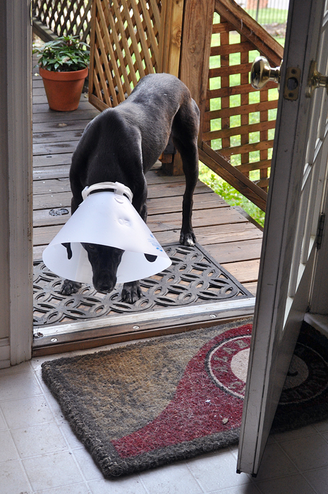 Poor Murray. The vet has determined he has a sty on his eyelid that is trying to rupture. That means antibiotics, pain meds and the dreaded cone of shame. . . so he won’t scratch it and damage his cornea.