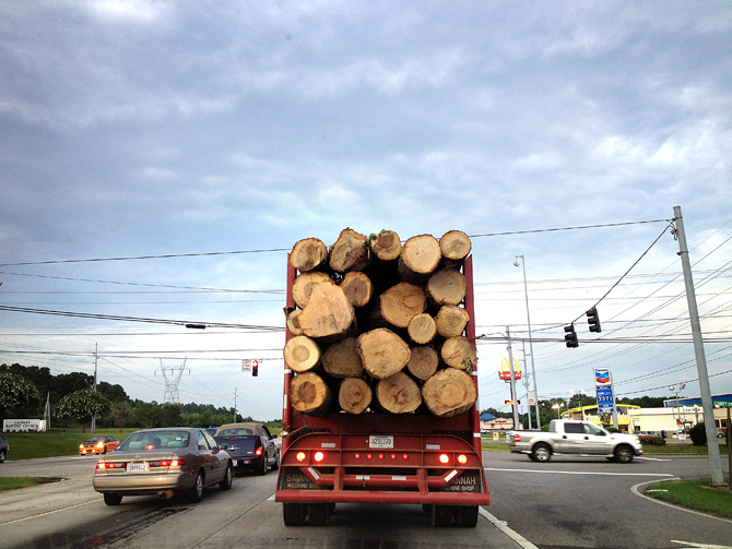 I was really busy today before, during and after work; so this was my only opportunity to get my shot of the day – a scene of the back of a log truck on Highway 72 in metropolitan Scottsboro.