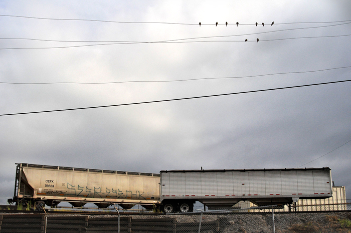 It rained again today, but stopped right before I left work. The light was so pretty, I decided to shoot the delivery area to the granary behind the paper. Birds hang around all of the time to steal as much grain as they can.