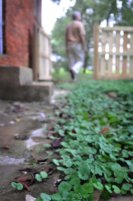 But it’s about time to go. We are about finished; but mostly, we are just tired. Joe and his dad built this fence, and I created this sidewalk last October. Now the broadleaf violet is started to creep over my work. Weeds! Nothing a weedeater won’t take care of.