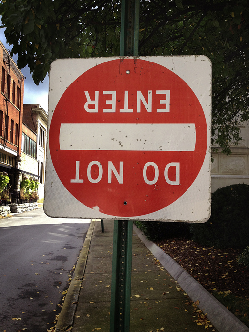 Typical. I wonder how long this sign has been like this? All it needs is a small nut and bolt to put it back into place. How much could that possibly cost? .50?