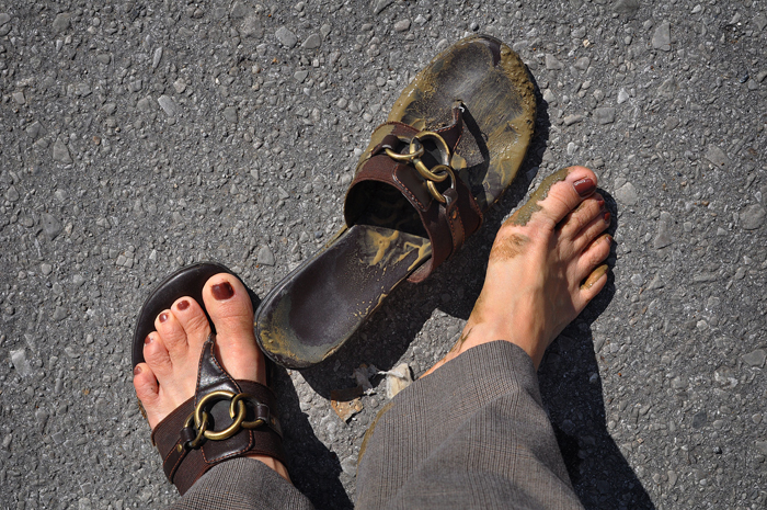 I tried to wipe off most of the mud before I got back in the car, but it was futile. I ended up rinsing off my feet in the women’s restroom at work. But all that did was clog the sink with mud and rocks. And it took 15 minutes to clean my sandals. Well, they are as clean as I could get them there. I’ll have to work on them again later.