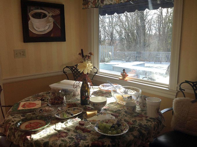 Anyway, she always puts out a lot of snacks before the meal, and this table is generally where everyone congregates most of the time.