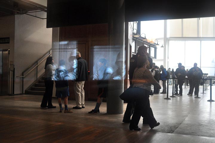 I love this photo. The reflections of the WWII soldiers in the window superimposed on the visitors is haunting to me. I jumped back when I saw them. I had no idea they were there when I shot the photo.