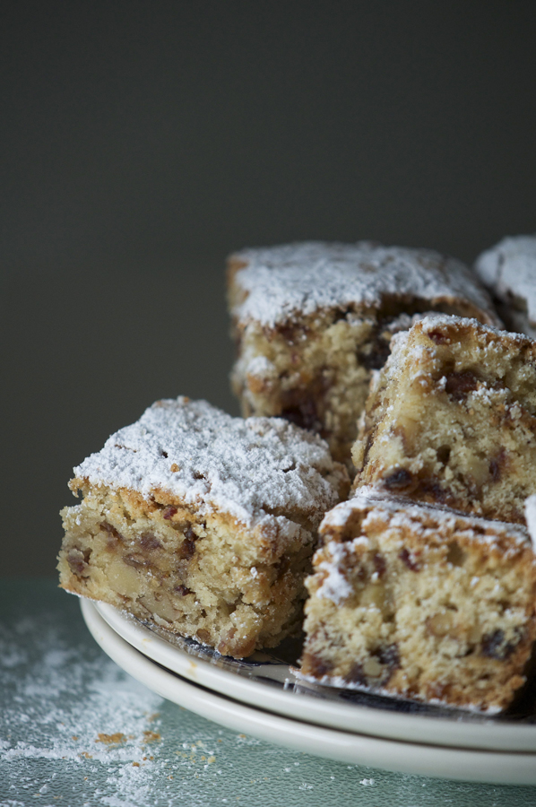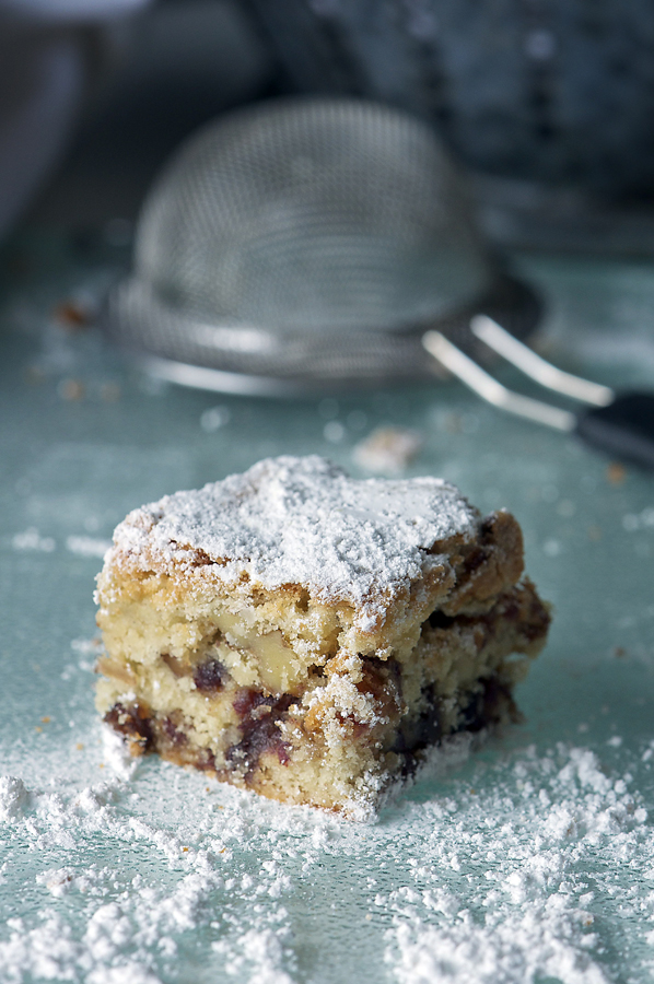 Preheat oven to 350 degrees F. Grease bottom and sides of a 9×13-inch baking pan and set aside. Combine flour, brown sugar, oats, salt, baking powder, baking soda and cinnamon in a food processor and pulse until just combined. Add butter and pulse until loose crumbs form. Reserve 1 cup of the mixture and set aside.